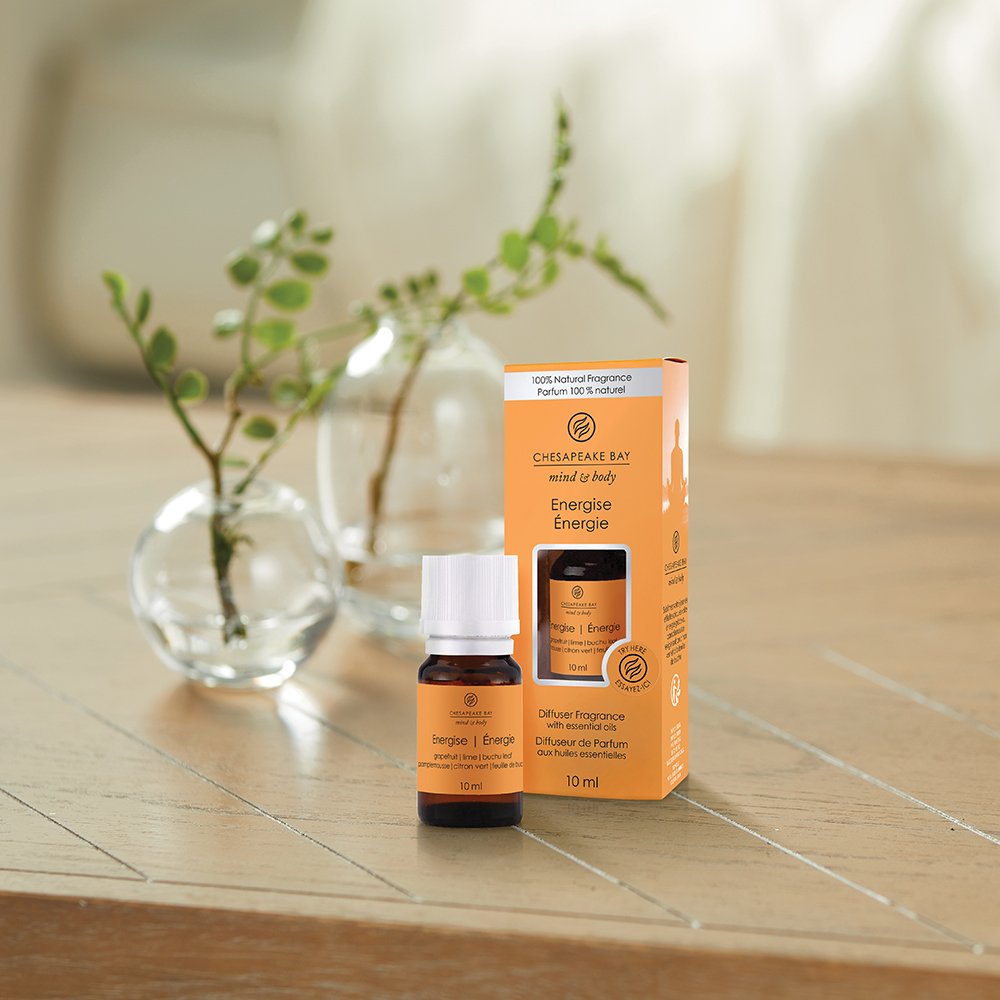 Energise The fragrance notes are as follows: Grapefruit, Lime and Buchu Leaf Help elevate the day and keep your energy flowing Not Applicable Our Chesapeake Bay Mind & Body Natural Diffuser Fragrances for Diffusers are 100% natural fragrance with essential oils. Our signature blends are inspired by aromatherapy benefits that help promote a sense of wellness. The collection consists of six 10 ml blends infused with essential oils and two 'state-of-mind' collections Relax and Vitality, that contain three fragrances each. Diffuse Chesapeake Bay Mind & Body Natural Diffuser Fragrances, following diffuser instructions, to create the ideal wellness ambiance to help enhance any mood.